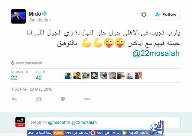 وكتب "ميدو" عبر الصفحة الشخصية له على موقع التواصل الاجتماعي "تويتر": "يارب تجيب فى الأهلى جول حلو النهاردة زى الجول اللى أنا جيبته فيهم مع إياكس.. بالتوفيق".
