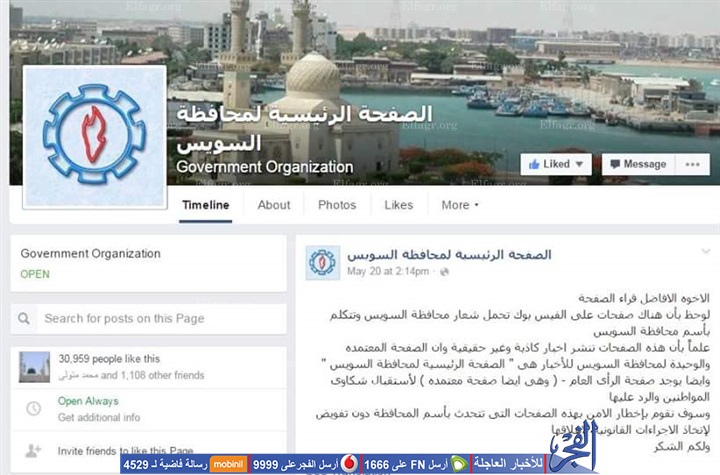 محافظة السويس تحذر من التعامل مع صفحات وهمية عبر "فيس بوك" ليس لها علاقة بالمحافظة