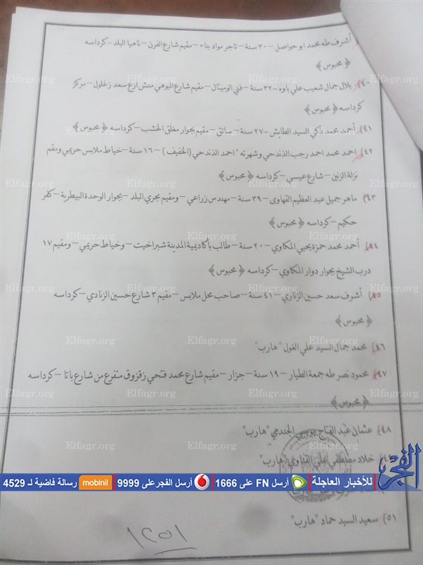 ومحمد حسن عبود أبو حمد 30 سنه فلاح "محبوس و احمد حمدي عبد الغني 37 سنه محامي "محبوس " و يوسف أحمد عبد الفتاح عبد الله طلب "هارب" و هيثم مجدى حنفى شحوت "هارب" و سعيد عبد العزيز جعفر "هارب و أحمد فتحى عبد الخالق الخشينى"هارب" و عبد النبى إسماعيل الجارحى زياده"هارب" و محمد عياد علي شنن "هارب " علي عياد علي شنن "هارب" و عصام يحيي علي عمر "هارب" وهيثم يحيي علي عمر "هارب " و خالد زكريا علي أبو سنه "هارب " و عبد الرحمن السيد علي القصاص "هارب " و فهد العقباوي السيد العقباوي 19 سنه طالب " مفرج عنه " و محمد علي الرشيدى "هارب" و هيثم فتحى خليل الطويل 20 سنه عامل "محبوس " وأحمد رفعت أحمد موسى "هارب" و أشرف طه محمد أبو حواصل 20 سنه تاجر مواد بناء "محبوس " و بلال جمال شعيب 32 سنه فنى الوميتال "محبوس " و أحمد محمد ذكى السيد الطايش 27 سنه سائق "محبوس" واحمد محمد أحمد رجب الذندحى 16 سنه خياط ملابس حريمي "محبوس" وماهر جميل عبد العظيم القهاوي 39 سنه مهندس زراهعي "محبوس.