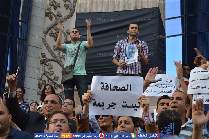 وردد الصحفيون هتافات: "إكتب على حيطة النقابة إحنا في دولة ولا في غابة"، و"روحوا واسألوا الجنرال خايف ليه من كام مقال"، و"عاوزين صحافة حرة العيشة بقت مرة"، ورافعين لافتات كتب عليها: "الصحافة ليست جريمة"، و"قولوا للنيجاتيف جوا وزارته حبس الصحفي يساوي إقالته".