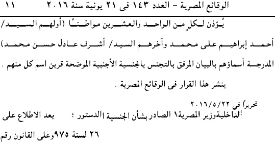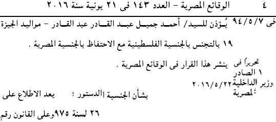 وبحسب الجريدة، فقد رفضت الوزارة، طلب إبراهيم محمد أبومغصيب (فلسطيني الجنسية) مواليد الشرقية اكتساب جنسية والدته المصرية وذلك لدواعٍ أمنية.