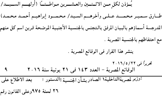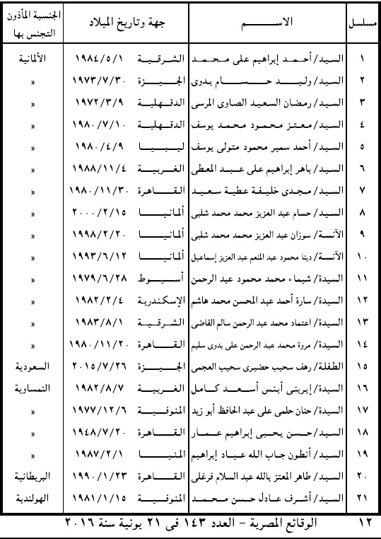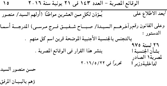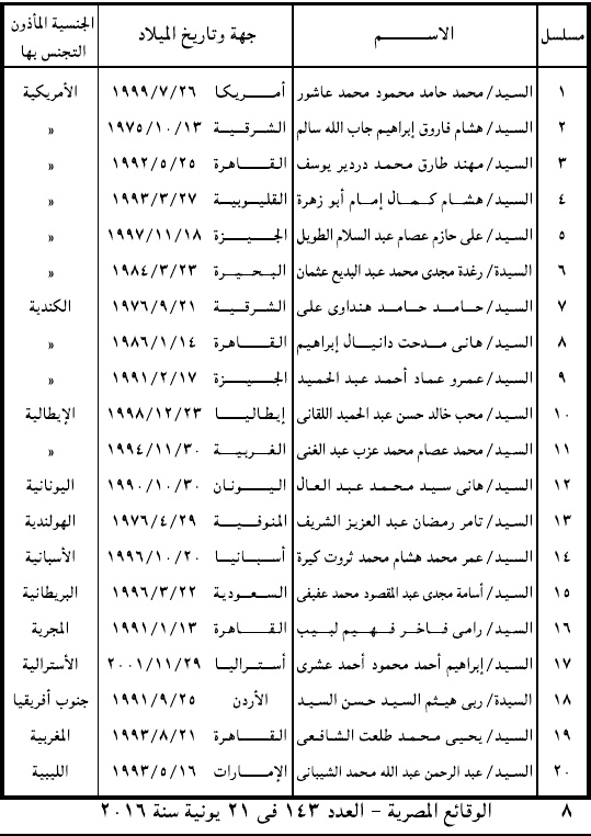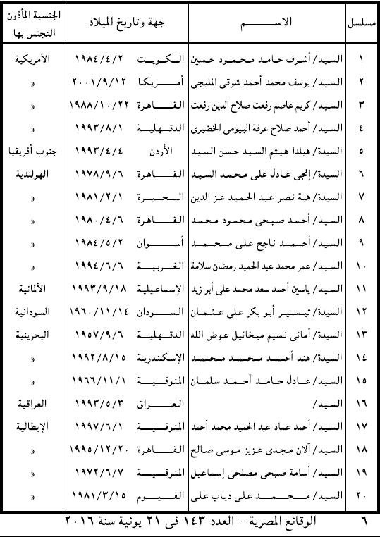 فيما نص القرار الآخر، على السماح لـ41 مصريًا بالتجنس بالجنسية الأجنبية مع عدم الاحتفاظ بالجنسية المصرية.