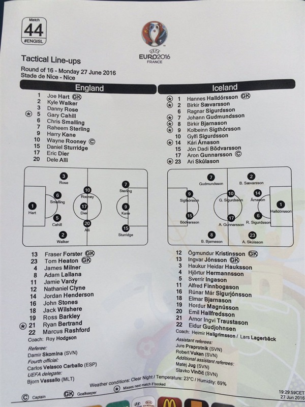 أعلن كلًا من مدربا منتخبي إنجلترا وأيسلندا تشكيلة منتخبيهما الرسمية، في المباراة التي ستجمع المنتخبين بعد قليل، ضمن منافسات دور الـ16 ليورو 2016.
