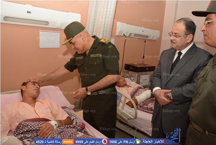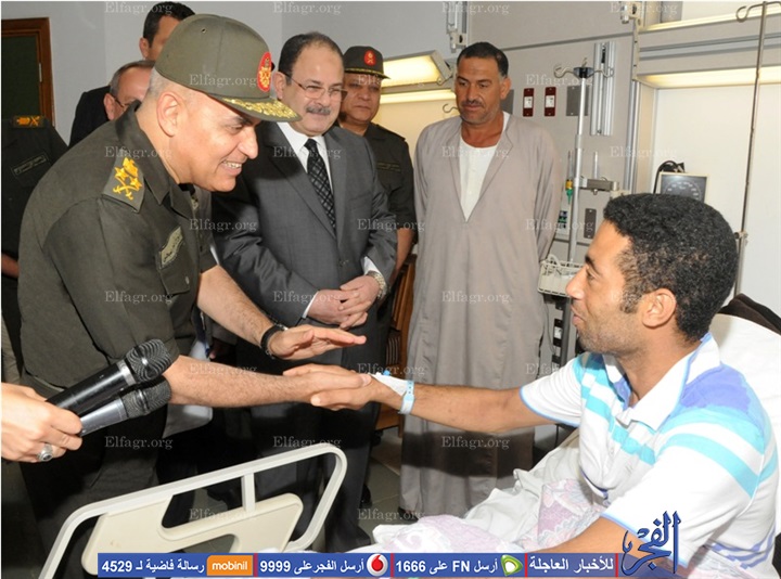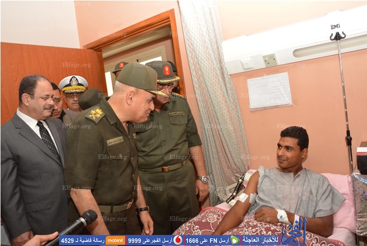 قام الفريق أول صدقي صبحي القائد العام للقوات المسلحة وزير الدفاع والإنتاج الحربي، يرافقه اللواء مجدي عبد الغفار وزير الداخلية، بزيارة عدد من المصابين من ضباط وصف وجنود القوات المسلحة والشرطة المدنية، والذين يخضعون حاليًا لتلقي العلاج بمستشفيات القوات المسلحة.