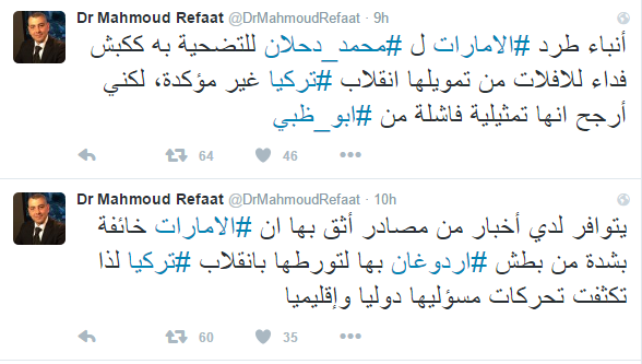 وأضاف "رفعت" - في تغريدة على صفحته الشخصية بموقع "تويتر": "يتوافر لدي أخبار من مصادر أثق بها أن الإمارات خائفة بشدة من بطش أردوغان بها لتورطها بانقلاب تركيا لذا تكثفت تحركات مسؤوليها دوليًا وإقليميًا".