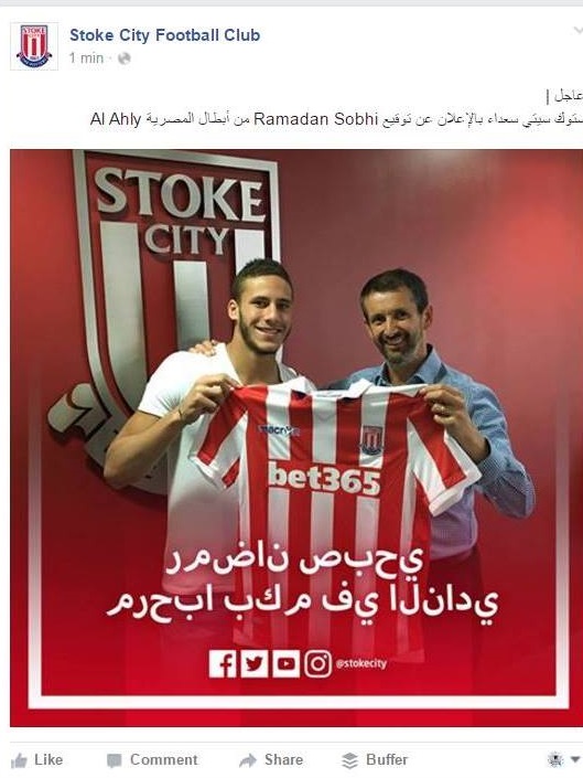 وقع نادي ستوك سيتي الإنجليزي في خطأ فادح عند الإعلان عن ضم رمضان صبحي لاعب الأهلي باللغة العربية.