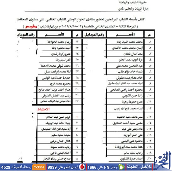 اعتمد محمد عبد المقصود - مدير عام مديرية الشباب والرياضة بكفر الشيخ، أسماء الشباب المشاركين في المرحلة الثالثة من منتدى الحوار الوطني للشباب "منتدى العاصمة"، والذي سينفذ خلال الفترة من ١٣ إلى ١٥ أغسطس بمديرية الشباب والرياضة بكفر الشيخ، برئاسة اللواء السيد إبراهيم نصر - محافظ كفر الشيخ، ورئيس المنتدى بالمحافظة، وبحضور جميع القيادات الشعبية والتنفيذية، و٣٠٠ من الشباب الذين تم اختيارهم من المشاركين في المرحلة الثانية للمنتدى بالإدارات الفرعية والجامعات والمعاهد العليا.