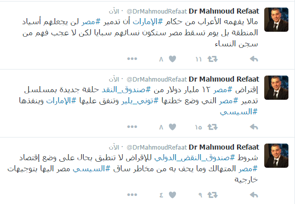 وأضاف "رفعت" - في تغريدة له على موقع التدوين "تويتر" - أن هذه الوساطة كلفت خزينة أبوظبي مليار دولار وبموجب هذا القرض المزمع إعطاءه لمصر، سيتم إقراض مصر 12 مليار دولار.