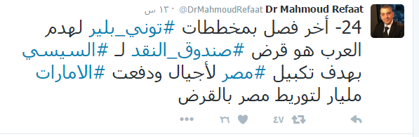 وأوضح "رفعت" أن "هذا القرض يأتي من أجل تكبيل مصر، وهو آخر فصل من فصول توني بلير - رئيس الوزراء البريطاني الأسبق - من أجل هدم العرب.