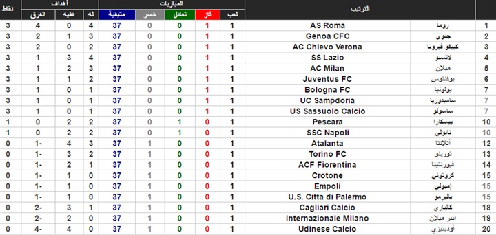 ترتيب الدوري الإيطالي عقب انتهاء الجولة الأولى