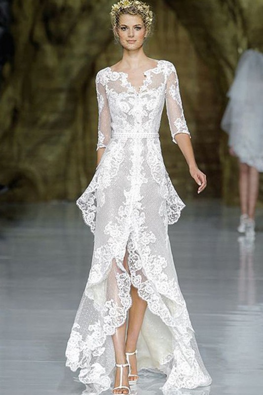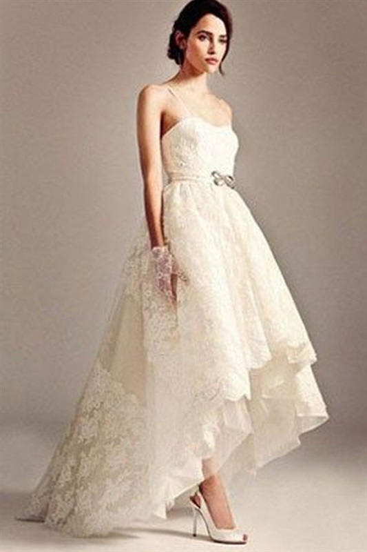 7- فساتين الزفاف القصيرة من الأمام والطويلة من الخلف تتناسب مع الزفاف المنعقد على شاطيء البحر أو في حدائق مفتوحة أو على حمام سباحة وبذلك فهذه الفساتين تتناسب أكثر لموسم الربيع والصيف.
