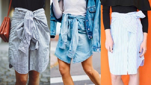 تحويل القميص الخاص بك إلى تنورة قد يبدو الأمر معقدا ولكن هذا ليس صحيح على الإطلاق. أنت فقط ستحتاجين إلى التعامل مع قميص فضفاض، لذا فهنا القميص الرجالي سيكون فكرة رائعة، ضعي ياقة القميص عند خصرك ومن ثم قومي بغلق أزرار القميص. اربطي الأكمام معا بهيئة عقدة ثم قومي بعمل فيونكة. في هذه الحالة ستحتاجين إلى ارتداء تنورة ضيقة قصيرة تحت القميص لكي تضمنين أنه لا يظهر تفاصيل جسمك من خلاله.