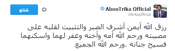 وكتب تريكة عبر حسابه الرسمي على تويتر: "رزق الله أيمن أشرف الصبر والتثبيت لقلبه على مصيبته، رحم الله أمه وأخته وغفر لهما وأسكنهما فسيح جناته، رحم الله الجميع".