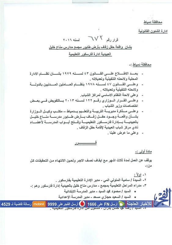 ومن جانبها قالت سلوى المتولي مدير الادارة التعليمية بفارسكور بمحافظة دمياط، والتي تم وقفها عن العمل أقر التحقيق معها في واقعة إقامة حفل زفاف في مدرسة العبيدية بمركز فارسكور وإدخال راقصات إلى فناء المدرسة، إنه تم تقديم مذكرة من أمن إدارة فارسكور التعليمية بالواقعة يوم الأحد الموافق 2 أكتوبر الحالي الساعة 10 صباحا لمكتب مدير عام الادارة وبناء عليه وبالرغم من أنه يوم عطله رسميه تم إستدعاء الشئون القانونيه بالإدارة ومديري المدارس بمجمع مناع خليل بالعبيدية للتحقيق وتم إستبعادهم لحين الانتهاء منه.