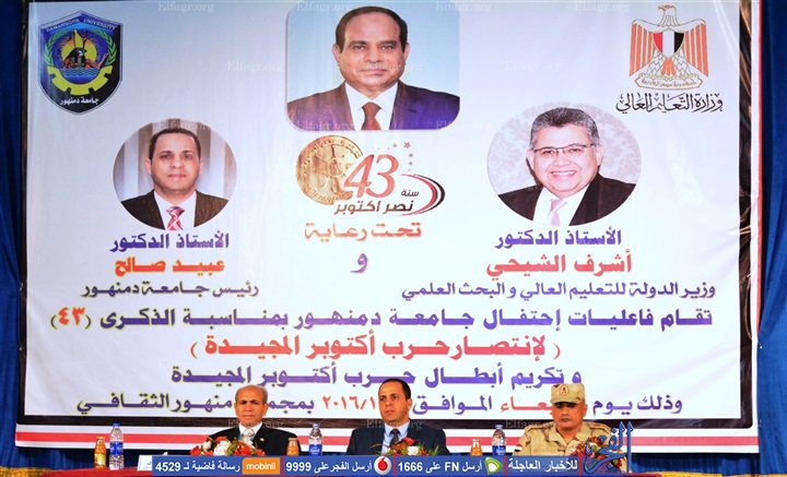 كرمت جامعة دمنهور أبطال انتصارات حرب أكتوبر، في حفل بمجمع دمنهور الثقافي في إطار احتفالات الجامعة بالذكرى الثالثة والأربعين، بحضور العميد ياسر أبو العينين المستشار العسكري لمحافظة البحيرة.