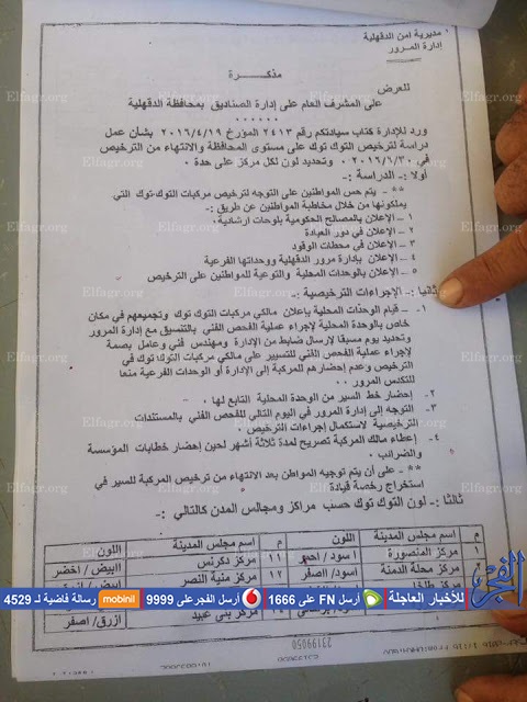 وان يكون لون التوك توك فى جمصه ابيض فى احمر"، المنزلة"ازرق فى برتقالى"، الجمالية "ازرق فى بنى"، المطرية "ازرق فى بنى" ميت سلسيل" ازرق" السنبلاوين "ابيض فى اصفر"، وتمى الامديد "ابيض فى برتقالى"، وميت غمر "ابيض فى بنى"، وأجا "ازرق فى اخضر".