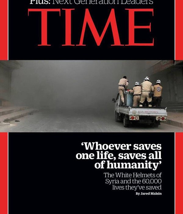 استشهدت مجلة التايم الأمريكية في عنوانها الرئيسي، بآية قرآنية عندما تحدثت عن أصحاب الخوذ البيضاء أو عمال الإنقاذ في سوريا.