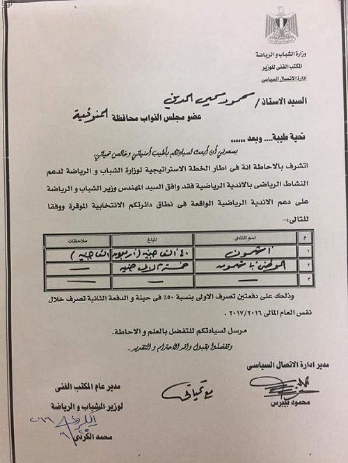 محي الدين قد تقدم بطلب لوزير الشباب والرياضة لدعم نادي اشمون والنادي الوطني وهو
