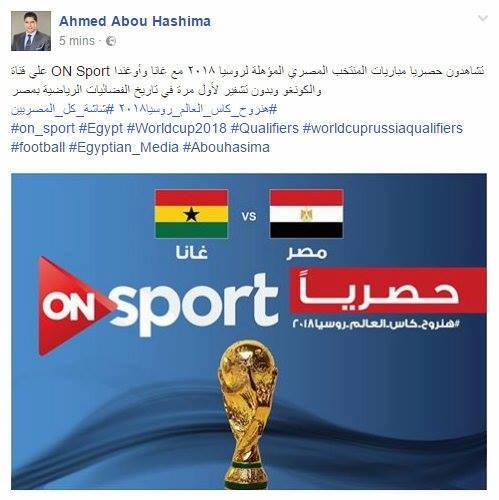 أكد رجل الأعمال أحمد أبو هشيمة مالك قنوات أون سبورت، أن قناة On sports ستقوم بإذاعة مباراة مصر وغانا حصريا، بجانب مواجهتي الكونغو وأوغندا على ملاعب المصرية.