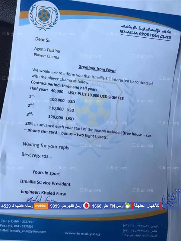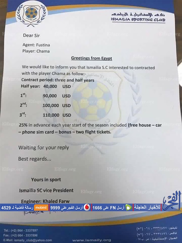 وأرسل مسؤولو الإسماعيلي فاكسا رسميا لوكيل