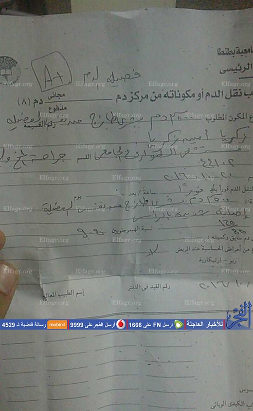 وأوضح شقيقه أن طبيب أمراض الدم أقر بتأخر الحالة وطلب عرضًا على طبيب متخصص في "الكلى"، ولم يتم عرضه إلا بعدهابـ48 ساعة، إضافة إلى صرف كيس بلازما غير صالح مرة أخرى، متابعًا أنه تم تحرير محضرين بالواقعة حملا رقمين 82ح قسم أول طنطا و2 ح.
