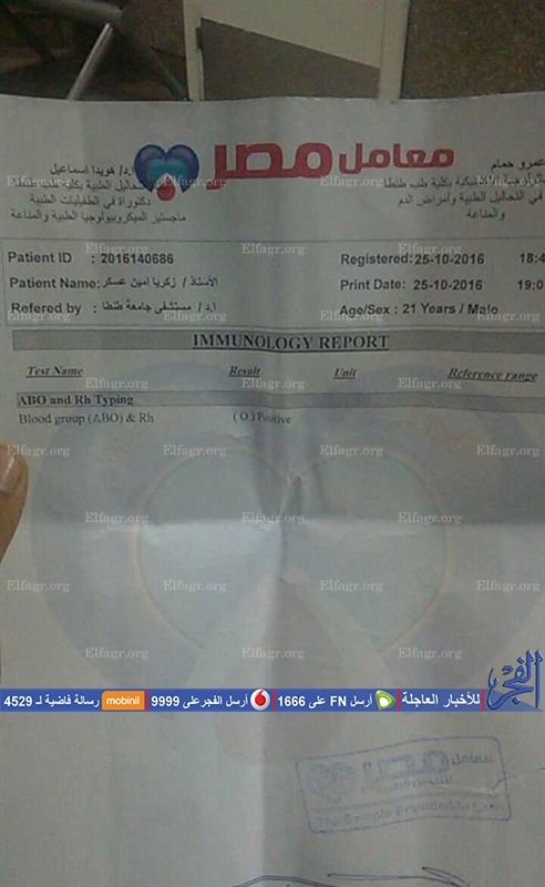 وقال عبدالغفار صبري عليمي، زوج أخت الضحية وإخصائي تحاليل بمركز الكبد في كفر الشيخ، إن شقيق زوجته تعرض لحادث أليم أثناء رجوعه لمنزله بمركز قلين في محافظة كفر الشيخ، وتم نقله إلى مستشفى الطوارئ بطنطا لإصابته بكسر في الفك وشرخ بسيط فى الجمجمة، وتم احتجازه في المستشفى لحين التأكد من "المخ والأعصاب"، مشيرًا إلى أن المستشفى طلب له دم، وتم إعطائه دم فصيله A موجب بدون عمل توافق رغم أن فصيلته O موجب.
