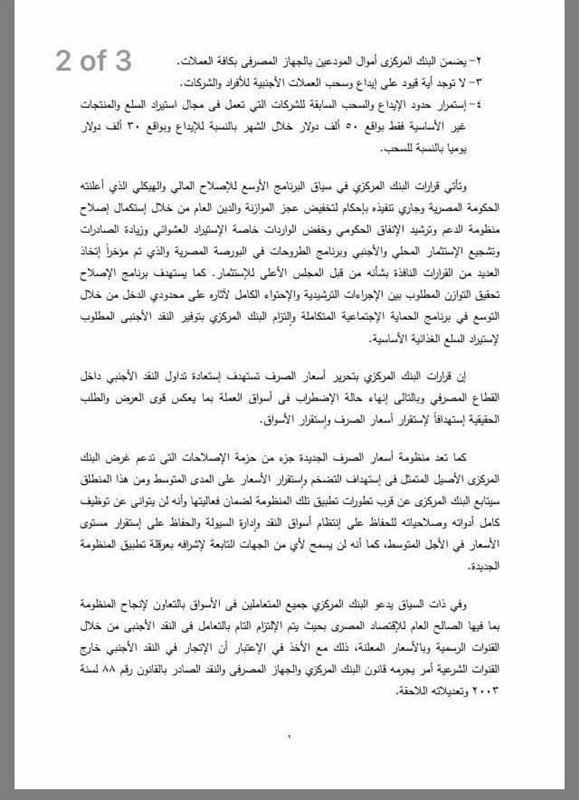 قال البنك المركزي، في بيان له، إنه قرر اتخاذ إجراءات عدة لتصحيح سياسة تداول النقد الأجنبي من خلال تحرير أسعار الصرف لإعطاء مرونة للبنوك العاملة في مصر لتسعير شراء وبيع النقد الأجنبي بهدف استعادة تداوله داخل القنوات الشرعية وإنهاء تمامًا السوق الموازية للنقد الأجنبي.