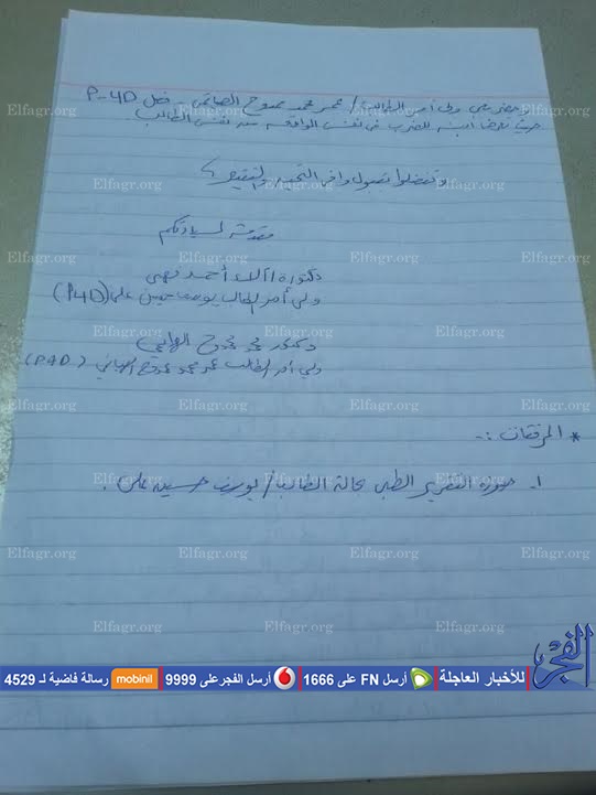 الكوم"، محضرًا ضد إدارة المدرسة وذلك عقب إصابة ابنها بارتجاج فى المخ بعد ضربه ضربا مبرحا خلال مشاجرة بينه وبين زميله