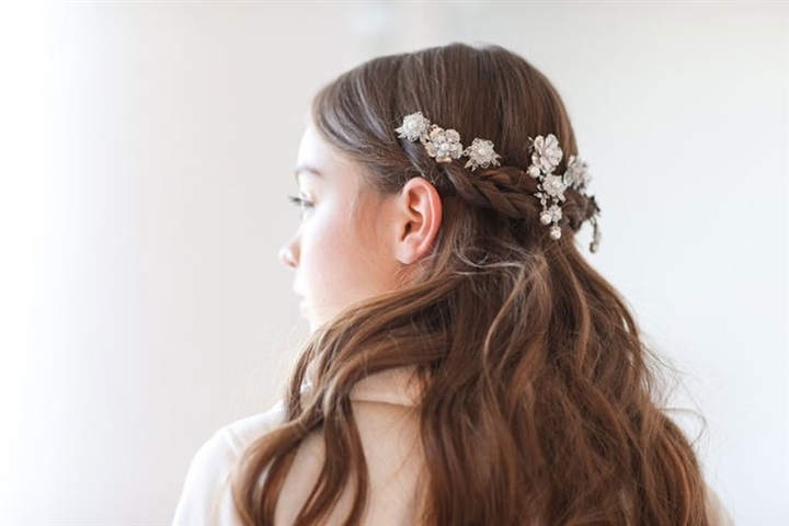 تسريحة ناعمة Half & Half بالجديلة المزينة بالإكسسوارات من عرض ماركيزا Marchesa.