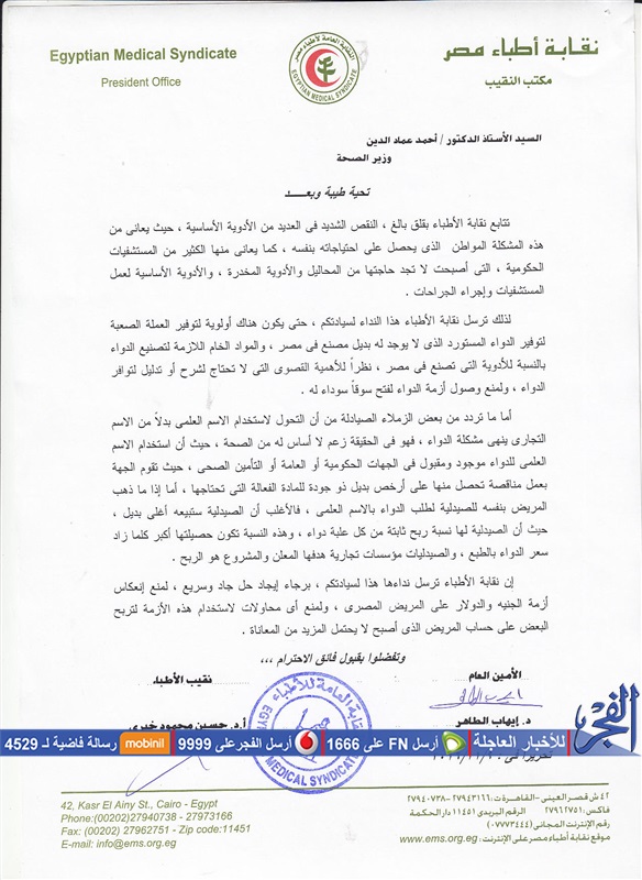 ناشدت النقابة العامة لأطباء مصر، كل من رئاسة مجلس الوزراء، وزيري الصحة، وزير المالية، بضرورة أن تكون الأولوية في ظل أزمة الدولار الحالية، هي الأدوية ومستلزمات العلاج.