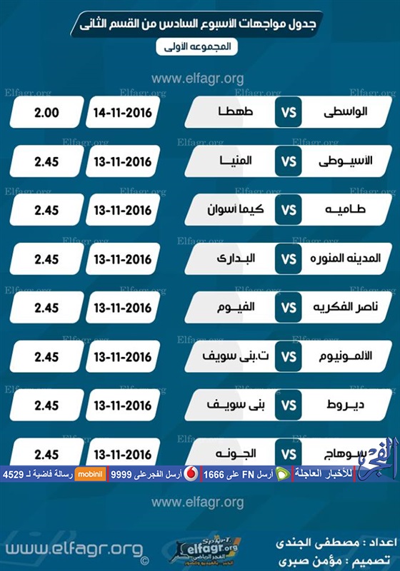 ويستضيف فريق طامية برصيد 3 نقاط نظيرة فريق كيما أسوان برصيد نقطتين، ويحل فريق الفيوم برصيد 6 نقاط ضيفاً على ناصر الفكرية برصيد صاحب الـ 3 نقاط .