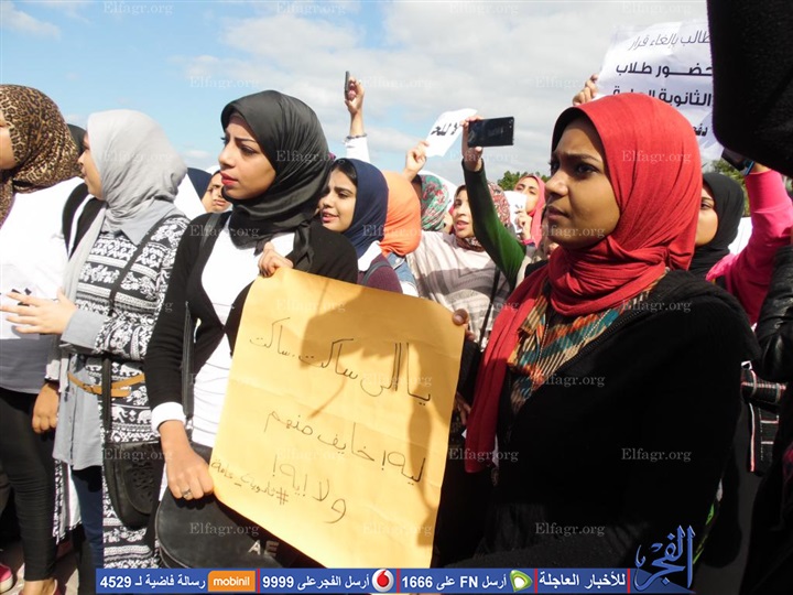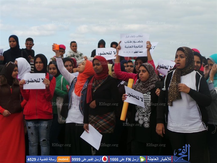 ورفع المشاركين فى التظاهرة بعض اللافتات منها "لا للحضور، نطالب بإلغاء حضور طلاب الثانوية العامة فى المدارس، ياللى ساكت ساكت ليه خايف منهم ولا ايه".