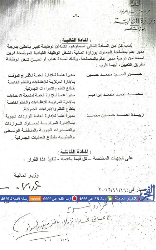 كما صدر قرارًا بندب حسن السيد محمد حسين لوظيفة مدير عام الإدارة العامة للإدارة العامة للإفراج المؤقت بالإدارة المركزية للإعفاءات والنظم الخاصة بقطاع النظم والإجراءات الجمركية، محمد أحمد محمد إبراهيم لوظيفة مدير عام للإدارة العامة لتابعة اﻹعفاءات بالإدارة المركزية للإعفاءات والنظم الخاصة بقطاع النظم والإجراءات الجمركية، وزبيدة أحمد حسين محمد لوظيفة مدير عام للواردات الجوية بالإدارة المركزية لجمارك الصادرات والواردات الجوية بالمنطقة الوسطى والجنوبية بقطاع العمليات الجمركية وذلك لمدة عام أو لحين شغل الوظيفة بطريق التعيين.