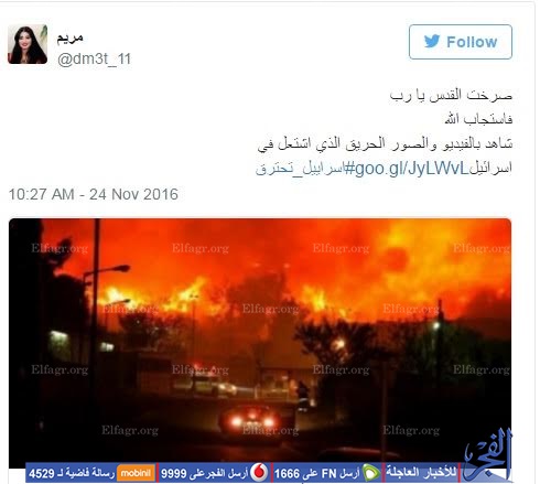 وأستعرضت الصحيفة تويتة للشيخ مشارى راشد العفاسى الذى يتابعه أكثر من 11 مليون شخص على حسابه ,والتى كتب فيها "كل التوفيق للحرائق ..إسرائيل تحترق ".