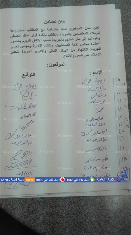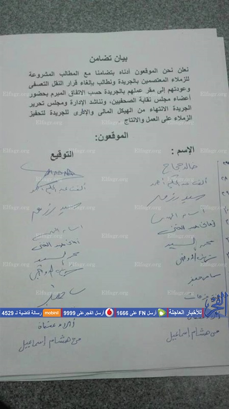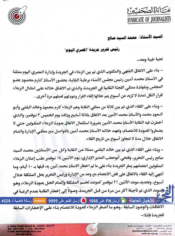 خاطب مجلس نقابة الصحفيين رئيس تحرير جريدة المصري اليوم بشأن استكمال الاتفاق بعودة الزملاء المنقولين "تعسفيًا بسحب زملائهم" حتى لا يضطروا للعودة للاعتصام.