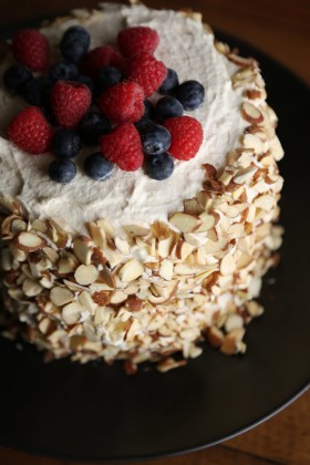 اليوم نقترح عليك تحضير كعكة بالكريمة يمكنك تحضيرها في 5 دقائق فقط ولا تحتاجين إلى خبزها في الفرن، بل فقط القليل من القشطة وشرائح اللوز المحمصة والتوت البري لستة أشخاص: