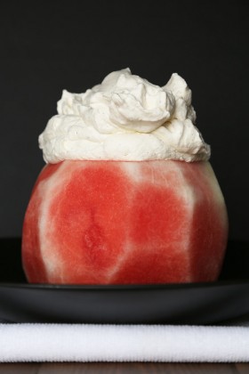 - حضري القشدة المخفوقة مع القليل من نكهة الفانيلا ثم غطي الجزء العلوي من حبة البطيخ بأكمله.