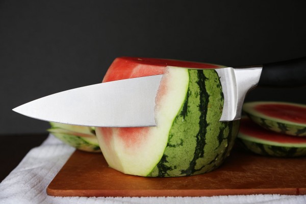 اختاري حبة بطيخ صغيرة الحجم من النوع الخالي من البذر وابدئي بإزالة القشرة من الأعلى والأسفل ثم من الجوانب. ضعيها على أرضية مسطحة وجففيها جيداً بمنديل نظيف لإزالة السوائل الزائدة. ثم ضعيها على طبق التحضير لتبدئي بتزيينها.