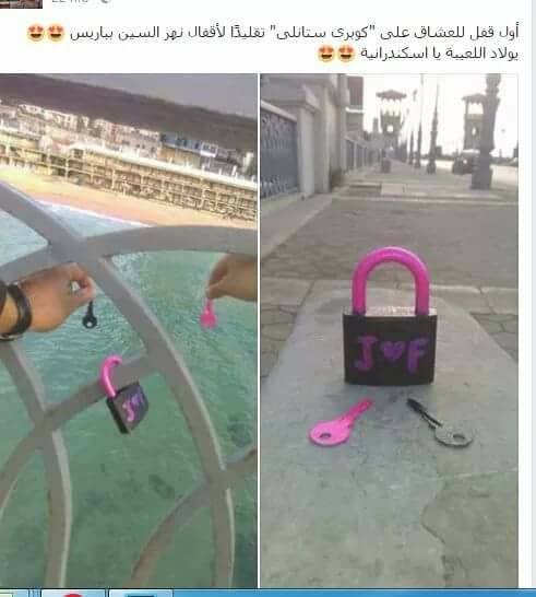 تداول عدد من نشطاء مواقع التواصل الاجتماعى صورة لـ"قفل الحب" الذي وضعهما الثنائي جوليا جورج وفادي ويليام على كوبري إستانلي بالإسكندرية، وقالوا إنه قد تم سرقته من مكانه.