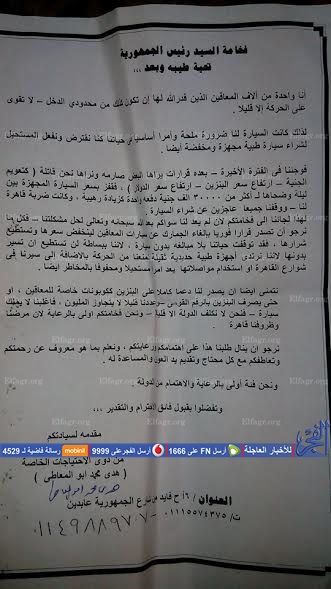 عن شراء السيارة، لهذا لجاءنا إلي فخامتكم لان لم يعد لنا سواكم بعد الله سبحانه وتعالى