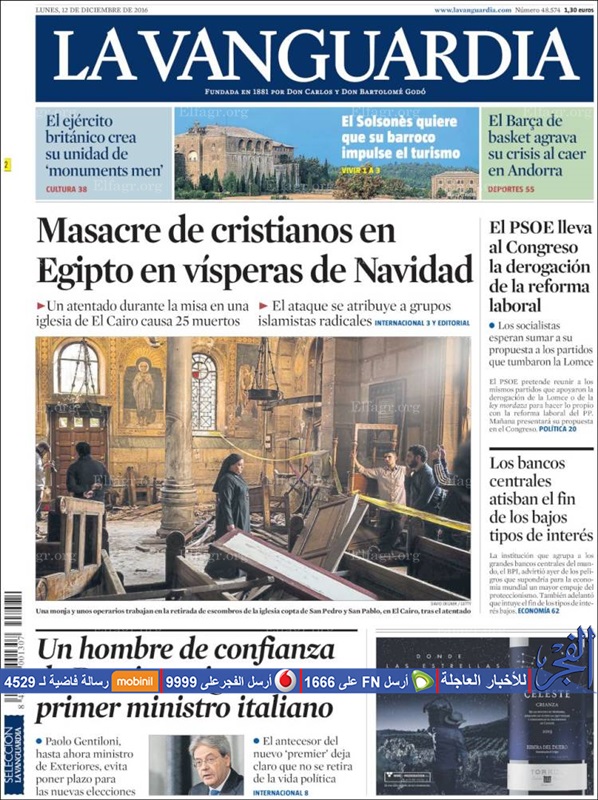 تصدّرت تفجيرات الكنيسة البطرسية بالقاهرة، واجهات الصحف الإسبانية الصادرة الاثنين، والتي وصفتها بالمذبحة، حيث راح ضحيتها 25 من الأبرياء.