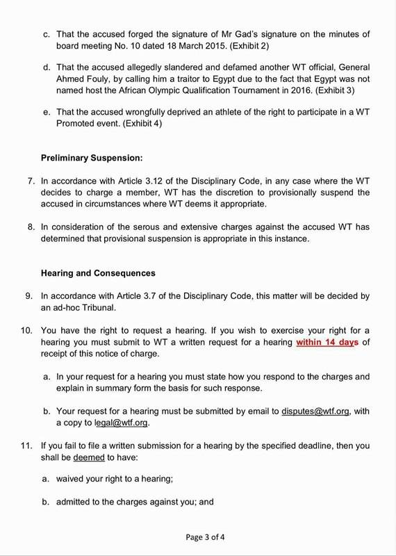 الدولى للتايكوندو من خلال خطاباته الرسمية بإيقاف فرج إلى اللجنة الأولمبية
