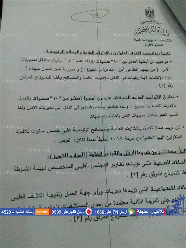 وتضمن الكتاب الدوري عددا من الشروط والمعايير التي يجب أن تنطبق علي الفرد الذي يرغب في النقل، وتمثلت أهمها بالنسبة للأفراد العاملين بمديريات الأمن أن يكون أمضي عشر سنوات بالعمل بالمنطقة المركزية، أو خمس سنوات بشمال الصعيد، أو ثلاث سنوات بشمال سيناء والمناطق النائية.