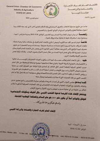 استنكَر الاتحاد العام لغرف التجارة والصناعة والزراعة الليبي، إصدار قرار من قبل مدير مكتب وزير الخارجية المفوض في حكومة الوفاق الوطني المقترحة لطفي الأمين المغربي بخصوص محاولة فرض المدعو "محمد عبدالكريم الرعيض" رئيساً للاتحاد العام للغرف دون مراعاة للنظام الأساسي وموافقة الجمعية العمومية للاتحاد في هذا التوقيت، لافتين إلى أنه محاولة غير مسؤولة للاستيلاء بالقوة على الاتحاد دون أي صفة قانونية.