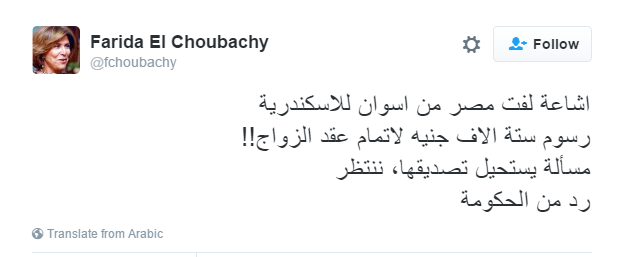 وكتبت "الشوباشي" - في تدوينة على حسابها بموقع التدوين القصير "تويتر"، اليوم الأربعاء - "إشاعة لفت مصر من أسوان للإسكندرية، رسوم ستة آلاف جنيه لاتمام عقد الزواج!!، مسألة يستحيل تصديقها، ننتظر رد من الحكومة".