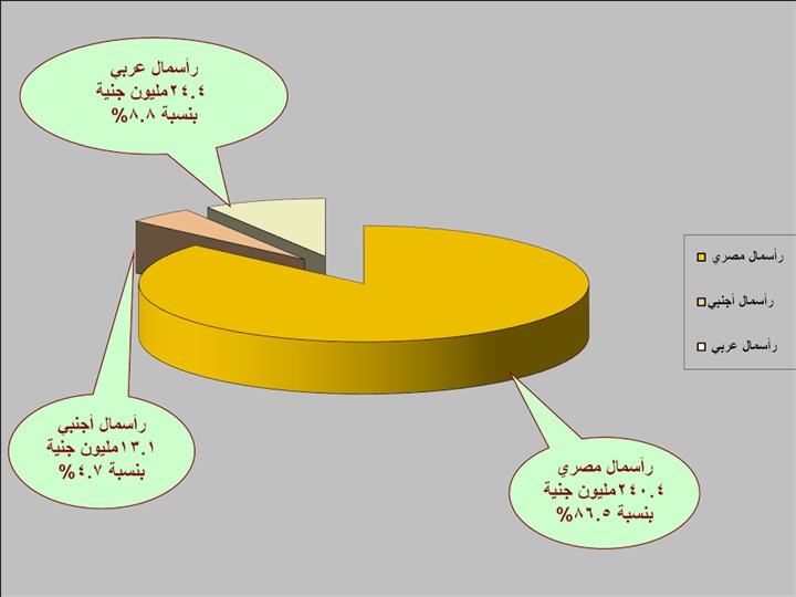 وبلغ رأس المال المصري في تأسيس هذه الشركات 240.4 مليون جنيه، و رأس المال العربي 24.4مليون جنيه، بينما مثل رأس المال الأجنبي 13.1 مليون جنيه، و تعمل هذه الشركات في القطاعات الزراعية والصناعية والسياحية والخدمية والإنشائية وتكنولوجيا المعلومات.