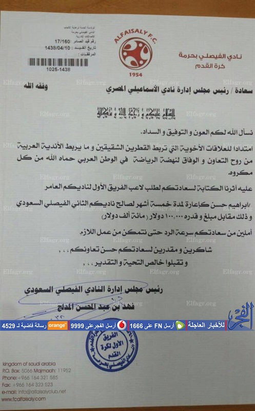 أرسل نادي الفيصلي السعودي فاكسًا رسميًا لنادي الإسماعيلي يطلب فيه استعارة نجمه إبراهيم حسن لمدة 5 شهور مقابل مليوني جنيه للدراويش.
