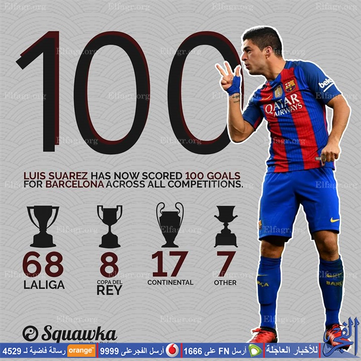 إنفوجرافيك.. سواريز يسجل الهدف 100 مع برشلونة