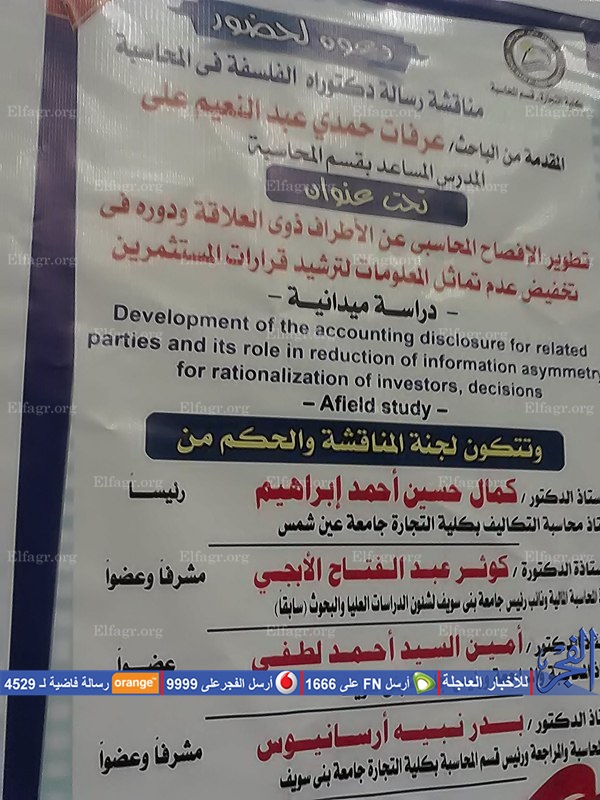 ناقش الباحث عرفات حمدي عبد النعيم علي، مدرس مساعد بكلية التجارة جامعة بني سويف رسالة دكتوراة عن الفلسفة في المحاسبة المالية المقدمة منه بعنوان "تطوير الافصاح المحاسبي عن الأطراف ذوي العلاقة ودوره في تخفيض عدم تماثل المعلومات لترشيد قرارات المستثمرين" .