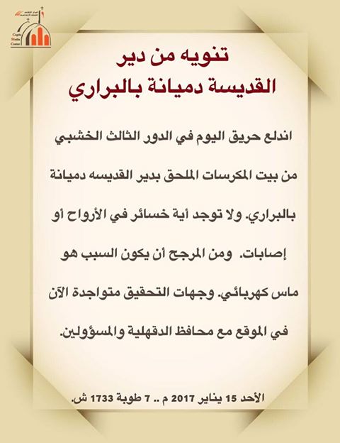 اندلع مساء أمس، حريق في الدور الثالث الخشبي من بيت المكرسات الملحق بدير القديسة دميانة بالبراري بلقاس بمحافظة الدقهلية.